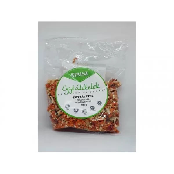 Vöröslencse (török), szárított sárgarépa, paszternák (EU), szárított pritaminpaprika (Kína), szárított paradicsom (Kína), pirított, szárított hagyma (Kína), pirított mogyoró (török), tört chili (Kína).