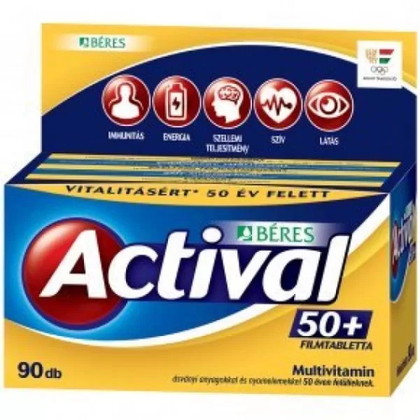 Béres Actival 50+ filmtabletta komplex étrendkiegészítő multivitamin ásványi anyagokkal és nyomelemekkel 50 éven felülieknek.