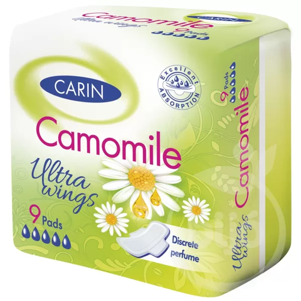 Próbálja ki Carin Ultra wings Camomile egészségügyi betünket, hogy a kellemes és diszkrét illatot árasztó betét alkalmazása során megtapasztalja a természetes tisztaság, kényelem és biztonság érzését is a nehéz napokon!
