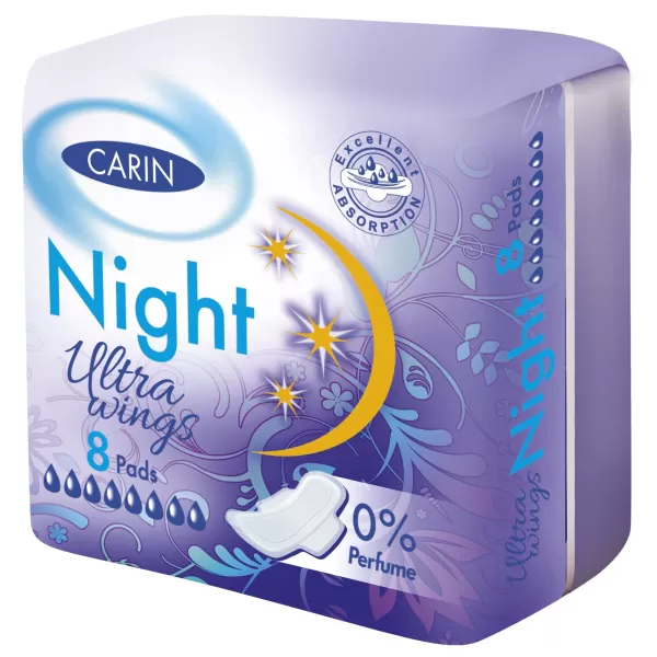 Próbálja ki Carin Ultra wings Night egészségügyi betétünket, hogy a diszkréció mellett megtapasztalja a természetes tisztaság, kényelem és teljes éjszakai biztonság érzését is a nehéz napokon!
