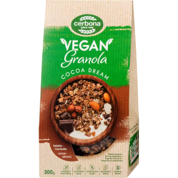 A Cerbona Vegán Granola kakaós-mandulás változata egy ízletes és tápláló reggeli opciónak számít. Gazdag mandula darabokban és kakaóban, így tökéletes választás mindazok számára, akik szeretik az egészséges, mégis finom ételeket.