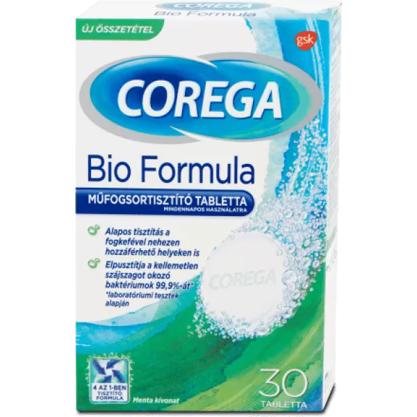 COREGA TABS MŰFOGSOR TISZTÍTÓ TABLETTA. Fehérítő hatású műfogsortisztító tabletta. Egy pohár vízbe helyezzük a pezsgőtablettát is, és a műfogsort is legalább egy éjszakára. Az aktív enzim eltávolítja a makacs lepedékeket. Feloldja és eltávolítja a tea, kávé és a nikotin okozta foltokat. Rendszeres, napi kétszeri használata esetén a műfogsor olyan gyöngyfehér lesz, mint újkorában.