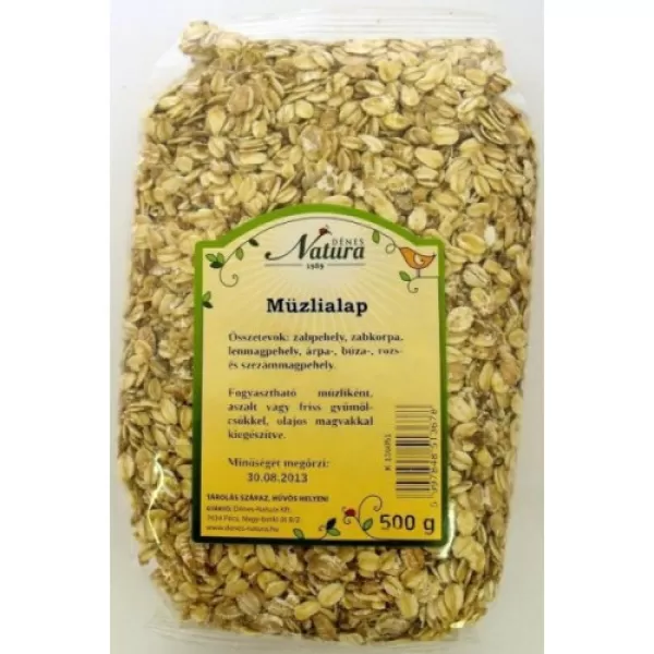 A Natura müzlialap 6 összetevőkből készült, ideális az otthoni müzlikészítéshez. A keverék tartalmaz búzát, rozst, árpát, zabbal, lenmaggal és szezámpelyhet. Ízlés szerint adhatóak hozzá olajos magvak és az egyénileg megszokott gyümölcsök, így egy gazdag és tartalmas müzlit alkothatunk.