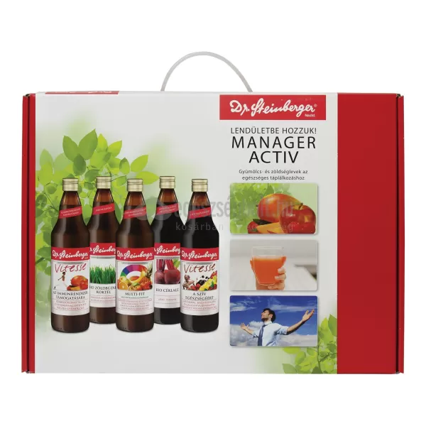 Az egészség megőrzésében, az aktív és teljes élet megvalósításában az egészséges táplálkozás sokat segíthet. A napi javasolt 40-50 dkg zöldség- és gyümölcsfogyasztás számos vitamint- és ásványi anyagot biztosít a szervezet számára. Ennek egy része fedezhető a „Manager Activ” csomagban található gyümölcs és zöldséglevekkel.