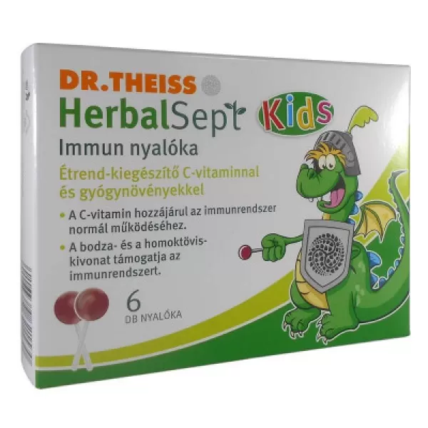 Dr.Theiss Herbalsept Immun nyalóka 6 db étrend-kiegészítő, mely C-vitamint és gyógynövényeket tartalmaz. A C-vitamin hozzájárul az immunrendszer normál működéséhez. A bodza- és homoktöviskivonat támogatja az immunrendszert.