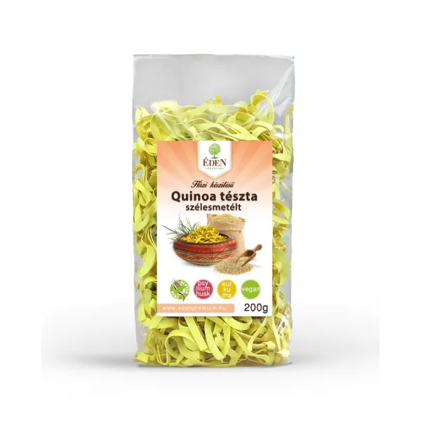 Éden Prémium Quinoatészta szélesmetélt 200g - Az inkák aranyaként is emlegetett quinoa Dél-Amerikából származik. Már 8-9 ezer évvel ezelőtt előszeretettel fogyasztották, az inkák pedig szent ételnek tartották, és a Magok Anyja néven emlegették. Az inka harcosok a quinoa magnak köszönhetően nagyon kitartóak voltak, és az átlagnál jóval gyorsabban gyógyultak fel a harcban szerzett sérüléseikből.