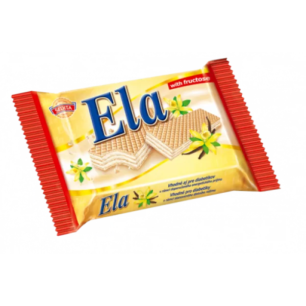 Ela ostya vaníliás 40 g és Ela nápolyi fruktózzal vaniliás 40 g. Vanília ízű krémmel (79%) töltött ostya fruktózzal.