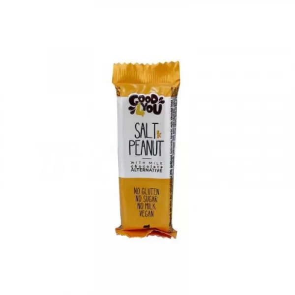 Good4you szelet sós földimogyoró ízben, gluténmentes és cukormentes, 25 g kiszerelésben. Gluténmentes, tejmentes, cukormentes, paleo, vegán, kókuszolajjal készült sós-földimogyorós szelet.
