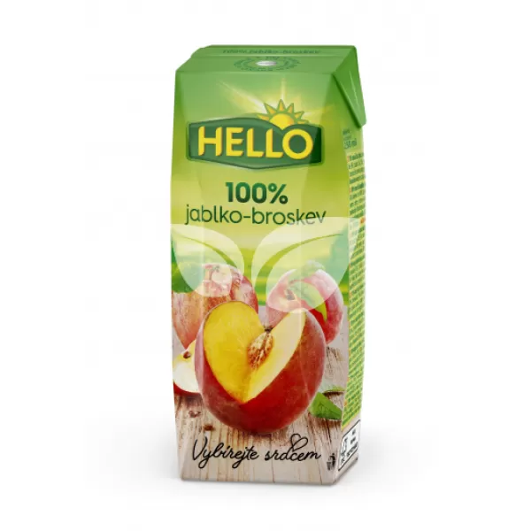 Fedezd fel a Hello alma-őszibaracklé 100% 250 ml kivételes ízét, amely friss almát és ízletes őszibarackot tartalmaz. A termék összetevői: almalé (90%), őszibarack püré (10%).