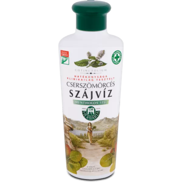 A Cserszömörcés szájvíz (menthol ízesítéssel) cserszömörce és kakukkfű kivonatát tartalmazza. Gyógynövény-hatóanyagai csökkentik a fogíny gyulladását, mérséklik a vérzést.