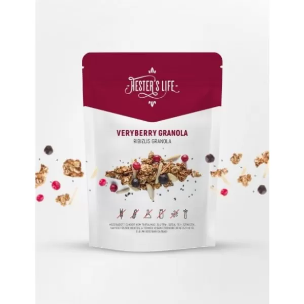 A Hester’s Life dietetikusa gluténmentes zabból, hozzáadott cukor nélkül és tisztán természetes alapanyagokból gondolta újra a granola fogalmát. A roppanós Veryberry Granolában domináló ízek a fahéj és vanília. Az ízletes liofilizált piros és fekete ribizli enyhén savanykás íze teszi izgalmassá a granolát. A mandula és a chiamag biztosítja a vitalitást, így a reggeli még táplálóbbá válik.