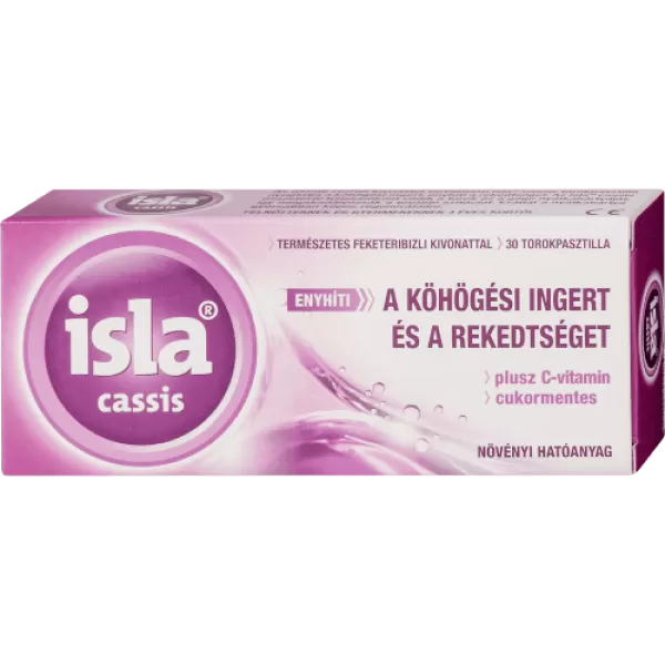 Az izlandi zuzmó kivonatot tartalmazó isla® cassis torokpasztilla nyugtatja a köhögési ingert, és enyhíti a rekedtséget. 4 éves kortól adható, cukormentes, feketeribizli ízű torokpasztilla, amely C vitamint is tartalmaz.