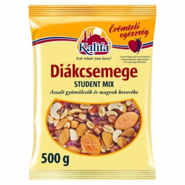 A Kalifa Diákcsemege pörkölt földimogyorót, kesudiót, mandulát, törökmogyorót, mazsolát, aszalt szilvát és aszalt sárgabarackot tartalmaz. Ezt a finom magvakból és a nyár összes ízét magukban rejtő aszalt gyümölcsökből álló keveréket az egészséges rágcsálnivalók kedvelőinek ajánljuk.