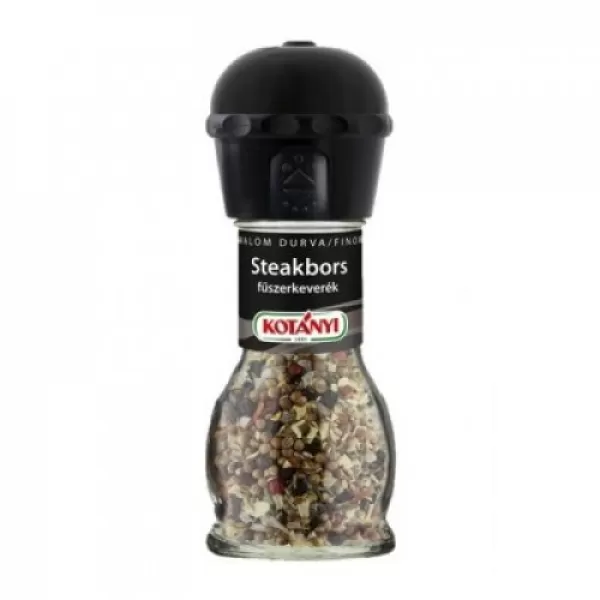 "Egy szaftos steak minden vacsora csúcspontja. A fűszerek harmonikus kombinációja, a tökéletes mennyiségű só és az intenzív borsos íz tökéletessé teszi a steaket. Ráadásul a malommal utófűszerezhetjük a húst az asztalnál is. A termék gluténtartalmú gabonaféléket, tojást, tejet (laktóz), zellert, szóját, mustárt és szezámmagot is felhasználó gyártóüzemben készült. Száraz helyen tartandó. Összetevők: jódozott tengeri só (tengeri só, kálium-jodát), (20%) bors, vöröshagymagranulát, fokhagymagranulát, koriander, rozmaring, rózsabors, kakukkfű, chili.