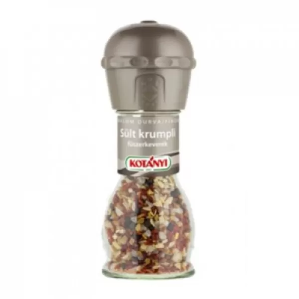 "A Kotányi Sült krumpli fűszermalommal nemcsak a sült krumplit fűszerezhetjük, hanem a tepsis burgonyát és más burgonyás ételt is. A termék gluténtartalmú gabonaféléket, tojást, tejet (laktóz), zellert, szóját, mustárt és szezámmagot is felhasználó gyártóüzemben készült. Száraz helyen tartandó.