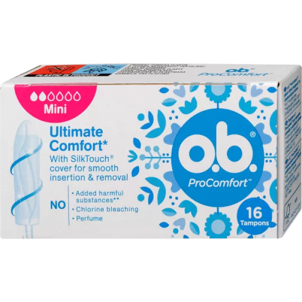 Az o.b. ProComfort Mini tamponok kifejezetten az alacsonyabb folyású napokra és a kezdők számára készültek. Az innovatív SilkTouch bevonat biztosítja a könnyű felhelyezést és eltávolítást, így még kényelmesebbé téve a mindennapi használatát.