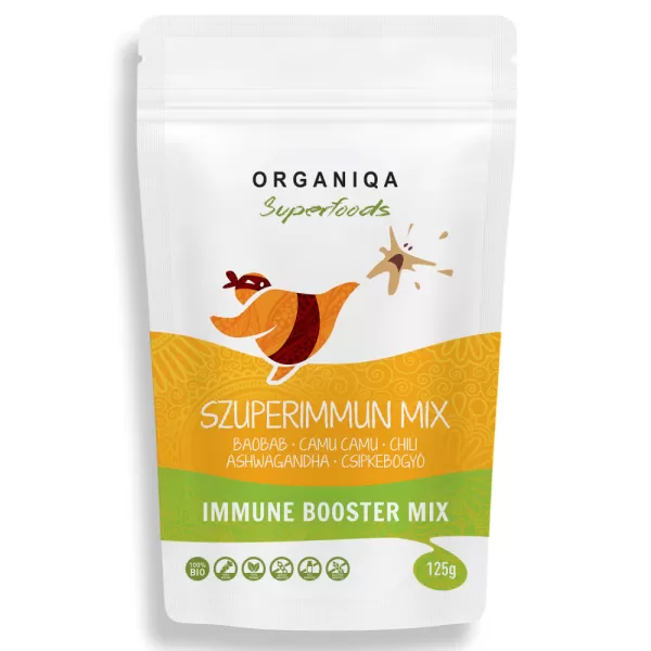 A Szuperimmun mix por több szempontból is egyedülálló az étrend-kiegészítők piacán. A C-vitaminban gazdag csipkebogyó, baobab és camu camu por mellett tartalmaz még adaptogén tulajdonságokkal rendelkező, immunerősítő ashwagandát, és vérkeringést serkentő chili port is. Egy, a szervezet számára nélkülözhetetlen superfood mix, amit bájos csomagolása tesz még ellenállhatatlanabbá.