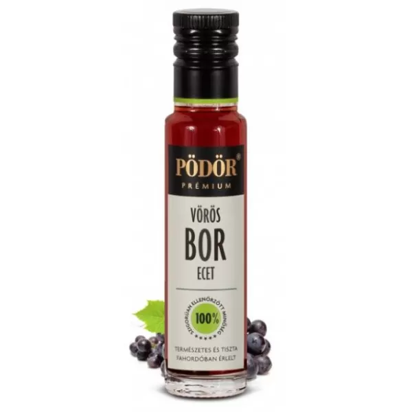 A Pödör vörösborecet tipikus, intenzív ízét a minőségi vörösbor, a speciális tárolási technológia és a sok éves tapasztalat biztosítja. 100% természetes, fahordóban érlelt ecet. Jól harmonizál leveles salátákra önmagában, de próbálja ki olyan intenzív olajokkal párosítva, mint a dió-, mogyoró-, szőlőmag-, vagy sárgabarackmag olaj.