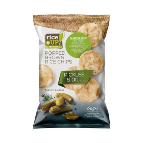 - Teljes kiőrlésű barna rizs chips savanyú uborka és kapor ízesítéssel.