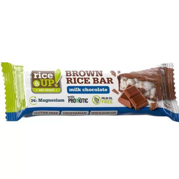 Egy ízletes, gluténmentes puffasztott teljes kiőrlésű barna rizsszelet, amely tejcsokoládéval van bevonva és nem tartalmaz hozzáadott cukrot.