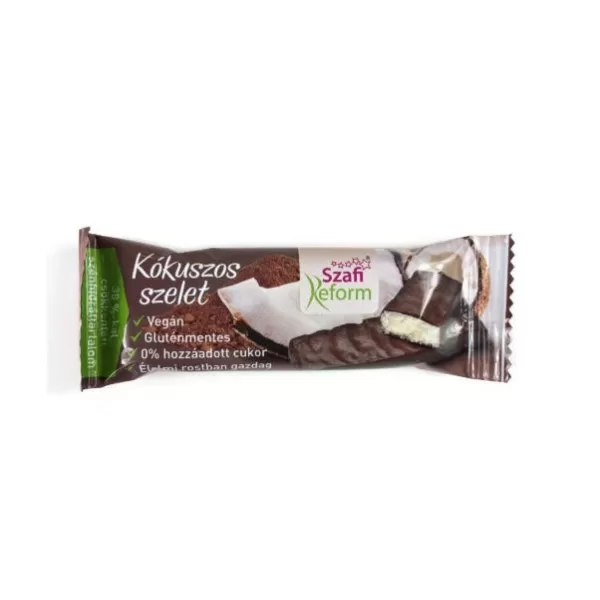 A Szafi Reform szelet kókuszos változata 25g-os kiszerelésben kapható. Kókuszos ízével és étcsokoládéba (20%) mártva, édesítőszerekkel készült. A termék hozzáadott cukrot nem tartalmaz, csupán természetes módon előforduló cukrokat.