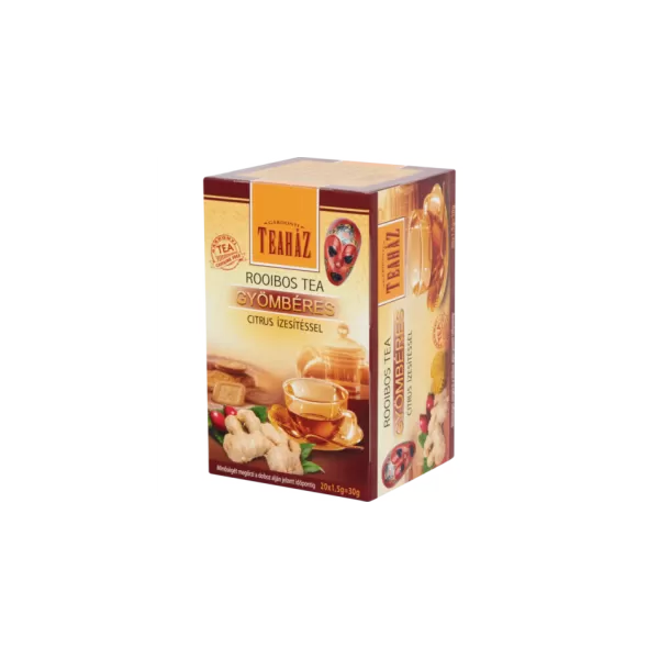 TEAHÁZ ROOIBOS TEA CITROMFŰ-GYÖMBÉRES Rooibos tea csipkebogyóval, citromfűvel és csipetnyi gyömbérrel gazdagítva. Enyhén fűszeres teakeverék, melyet a rooibos édeskés, jellegzetes íze, a gyömbér keleties, fűszeres aromája tesz teljessé.